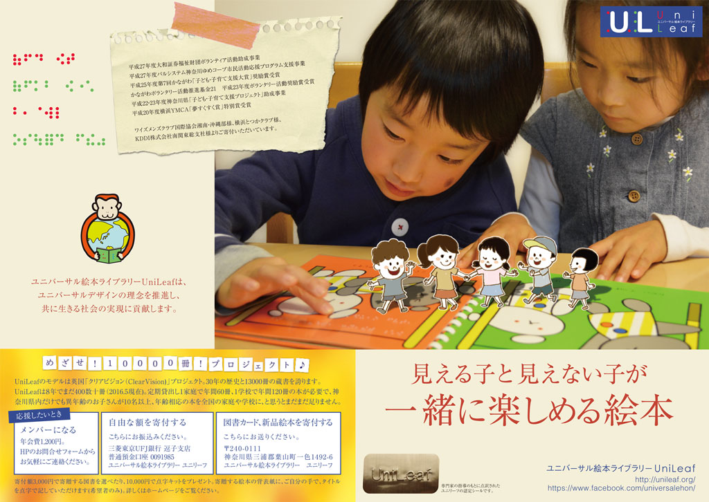 セカンドブックアーチはユニバーサル絵本ライブラリー「NPO法人ユニリーフ」と協働し、より多くの点字絵本を普及するために活動をしています。