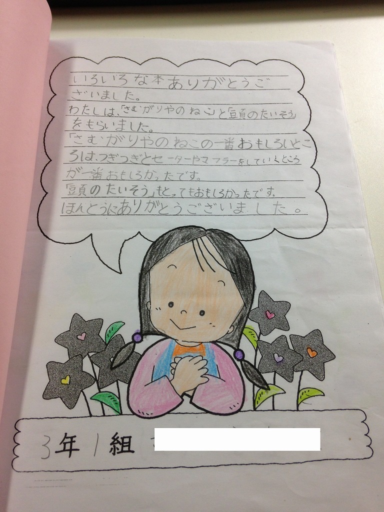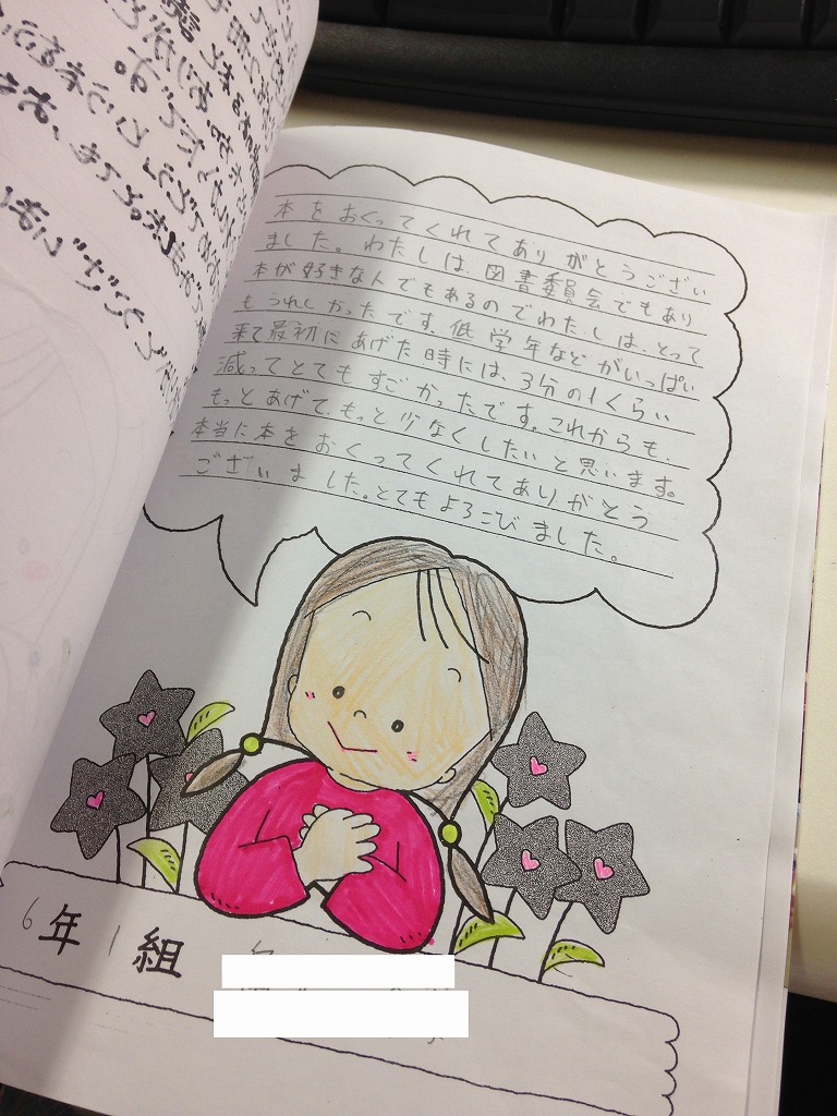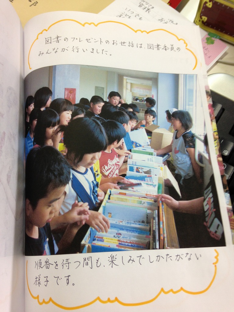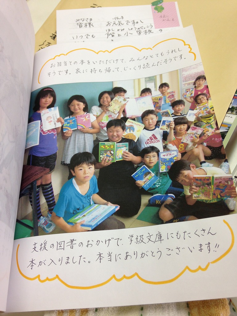 階上小学校の子どもたちへ絵本や児童書を寄贈している写真や子供たちのお礼のメッセージがまとめられた素敵な小冊子です。