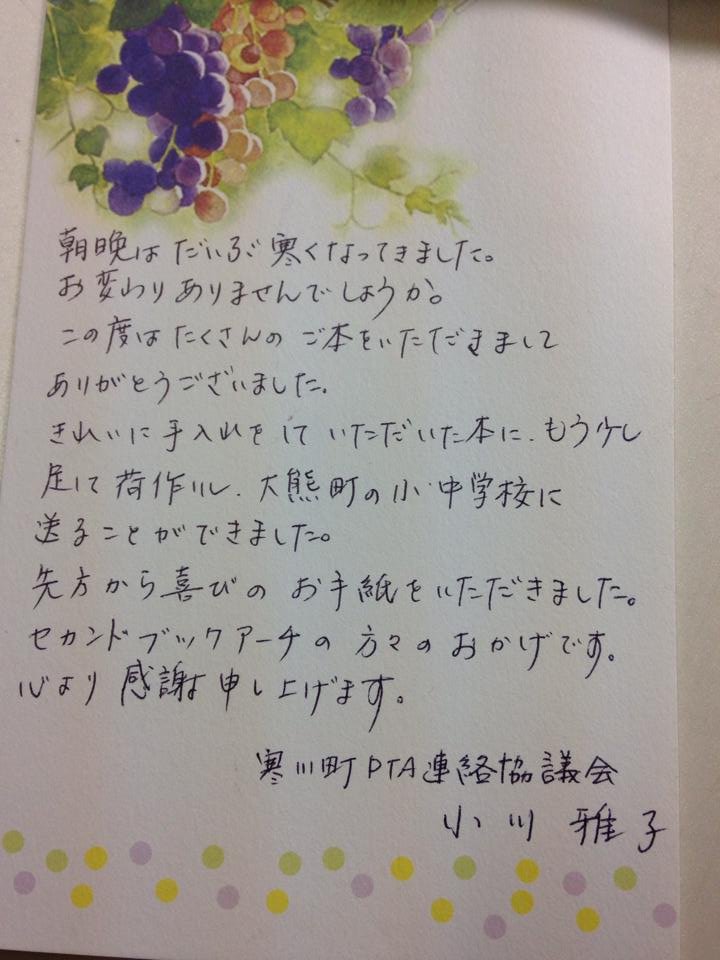 先月、「被災地に本を贈ろうプロジェクト」の一環として寒川町PTA連絡協議会を通して福島県大熊町の小中学校に児童書を寄贈させていただきました。