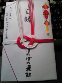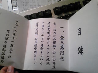 ほのぼの運動協議会様よりほのぼの運動2010年度地域貢献プロジェクトの支援基金として3万円を寄付していただきました。